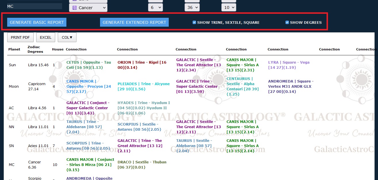 2) Click on GENERATE BASIC REPORT or GENERATE EXTENDED REPORT. The EXTENDED REPORT has more details/options but requires more Astrology knowledge. The most Significant Star connections are the Conjunt, then Opposite. Trine, Sextile and Square button option adds to the complexity of your soul history. SHOW DEGREES button will display the Degrees (0 to 29) and Minutes (0 to 59):